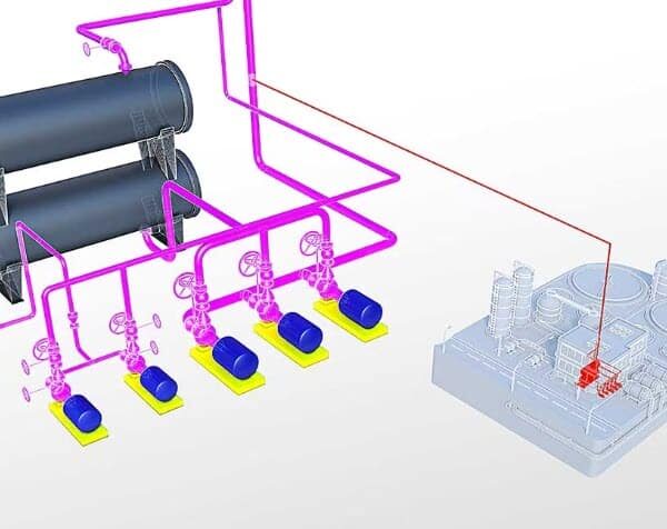 - Parametric Equipment Modeling: Quickly create and place parametric equipment models using a library of standard templates for pumps, tanks, heat exchangers, and more. You can easily adjust dimensions to match your project’s specific requirements.