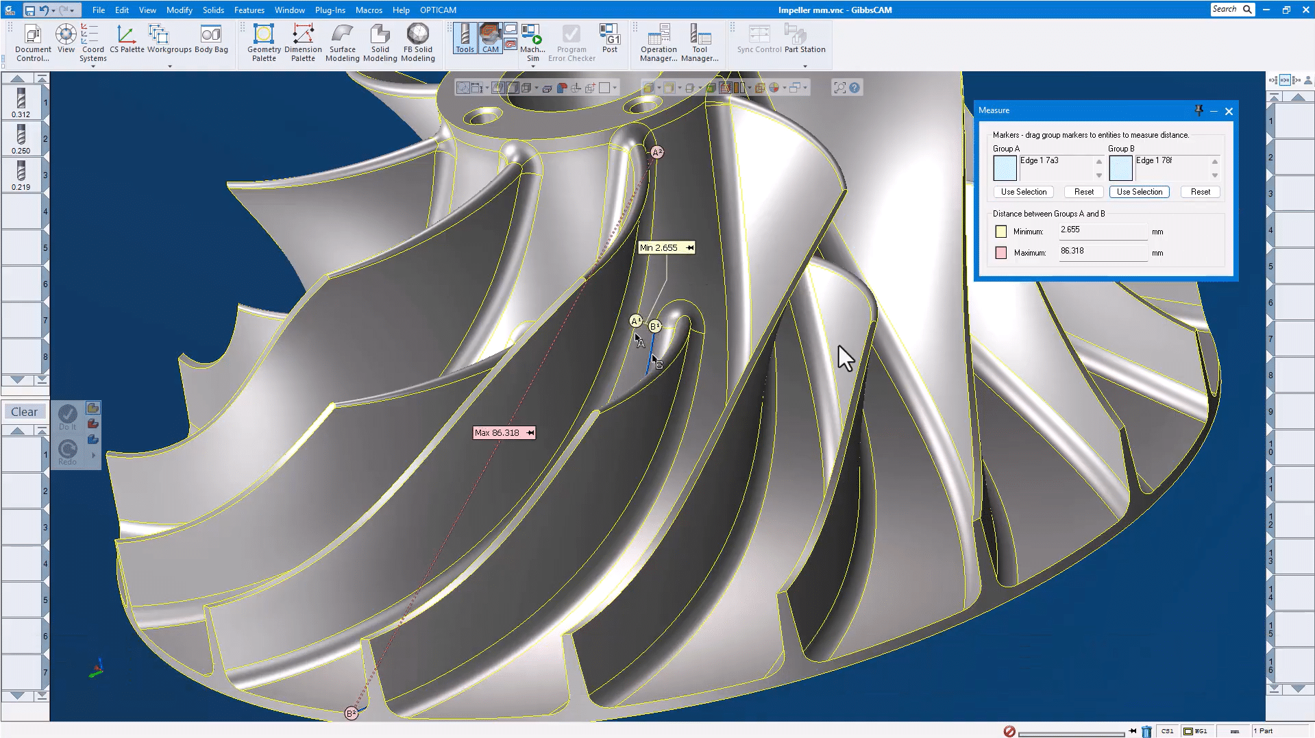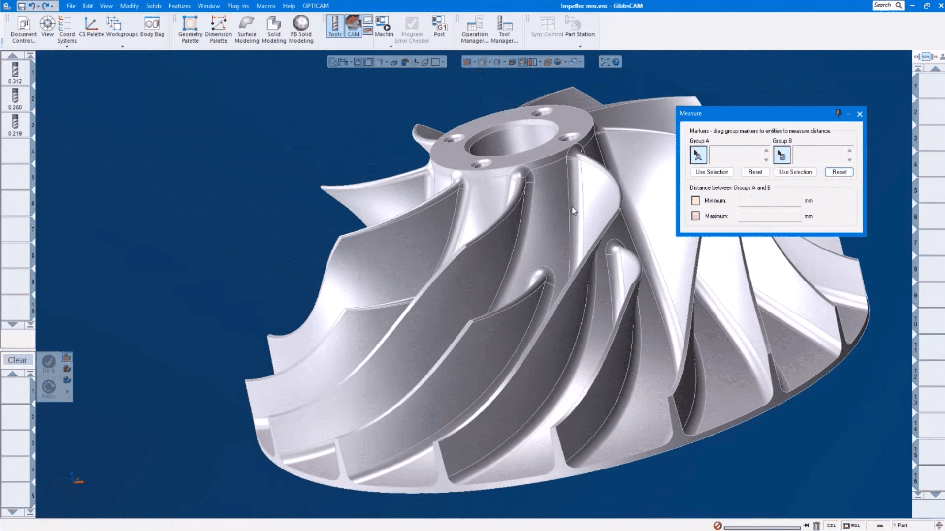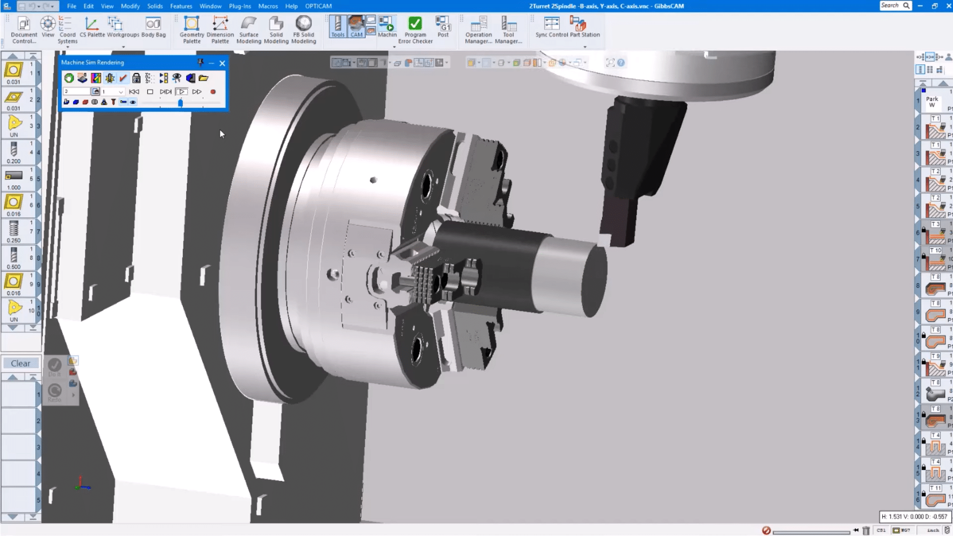 - Accurate Machine Simulation: Avoid costly mistakes and collisions with GibbsCAM’s built-in machine simulation. Visualize the entire machining process in a realistic 3D environment, including the machine tool, fixtures, stock material, and parts. This feature gives you the confidence that what you see on the screen is what you’ll get at the machine.